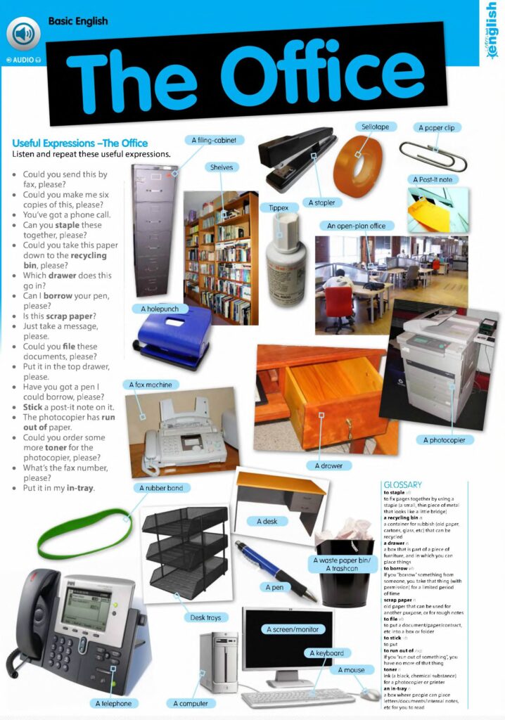 Это набор базовых фраз и лексики для повседневного офисного общения: просьбы, действия с документами, канцелярия, техника.